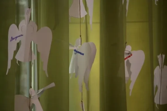 Родителям ушедших детей раздают бумагу. Из нее они вырезают ангелов. Подписывают именами своего ребенка.