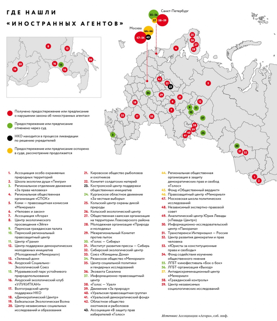 Легко также заметить, что по территории России выявленные прокурорами «иностранные агенты» распределяются неравномерно (см. карту на стр. 22). Наряду с Москвой и Санкт-Петербургом есть еще несколько точек их повышенной концентрации — например, Пермь, Челябинск, Мурманск и Новосибирск. «В разных регионах разная активность неправительственных организаций: в Перми или Новосибирске, например, она выше, чем во многих других регионах, — поясняет глава ассоциации «Агора» Павел Чиков. — Отличается и степень агрессивности местных прокуратур, поэтому, скажем, Дальний Восток практически не отметился какими-то серьезными наездами на НКО».