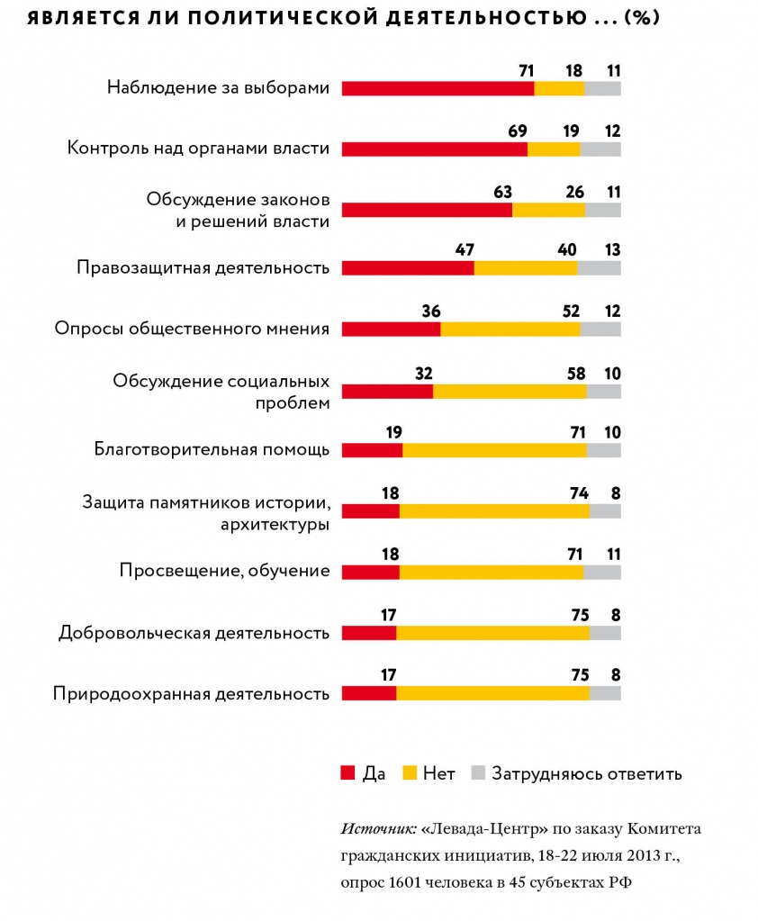 Осенью прошлого года по заказу Комитета гражданских инициатив Алексея Кудрина ЦПТ подготовил доклад о состоянии гражданского общества России. В нем констатировалось, что особой нужды в НКО россияне действительно не испытывают — за исключением разве что тех, что предоставляют конкретные блага (например, социальные), а не абстрактную защиту прав и свобод. Да и в понимании термина «политическая деятельность» наши граждане, как выяснилось, весьма близки к прокурорам, которые тоже считают «контроль над властью» или «обсуждение законов» чистой политикой (см. графики).