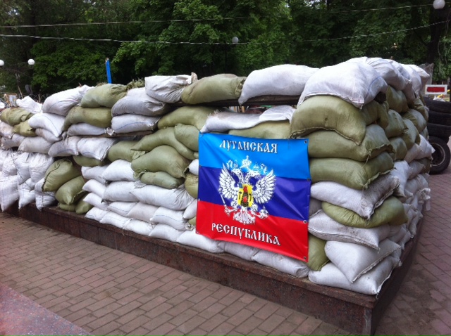 Когда на входе в лагерь сторонников "Луганской народной республики" говорю, что я приехала из Праги, меня спрашивают: "Это в Венгрии?" Второй вопрос, видела ли я по дороге сюда блокпосты? Говорю, что видела, но там развевался красный флаг, так что я даже не поняла, чей именно блокпост это был. "Это наш!" – отвечает молодой человек и сообщает: для того, чтобы сделать фотографии палаточного городка у захваченного здания СБУ, нужно получить разрешение. Он проводит меня до местного "штаба" – небольшой палатки – где отвечают, что за разрешением придется идти к зданию областного совета. Баррикады, представляющие собой сложенные друг на друга мешки с песком, построены по периметру небольшой территории с палатками, медпунктом, что-то наподобие полевой кухни, над которой развеваются флаги Украинской ССР, России, "ЛНР", который очень похож на флаг "ДНР". На вопрос об объединении с соседней так называемой Донецкой народной республикой я получаю ответ "No comments".