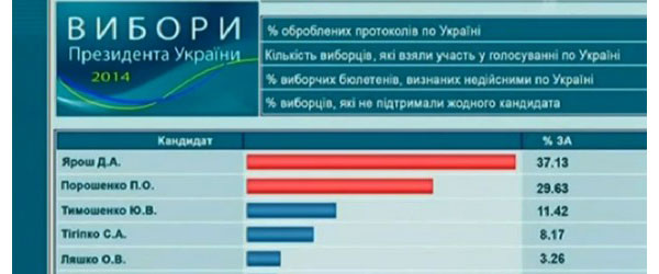 Но какое бы заявление по итогам голосования не огласил МИД или даже президент России, для многих показательным оказался сюжет, который был показан в воскресенье вечером в новостях Первого канала. Согласно представленному графику, который был якобы опубликован на сайте ЦИК Украины, первое место заметным отрывом занимает кандидат от «Правого сектора» Дмитрий Ярош, Петр же Порошенко отстает от него на целых 7,5 процентных пункта.