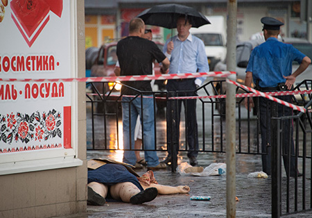 Женщина, убитая осколком на привокзальной площади Донецка. Фото: Илья Питалев/Коммерсантъ.