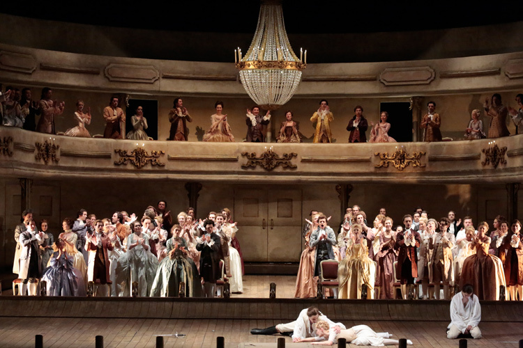 © Дамир Юсупов / Большой театр В конце спектакля его участникам раньше настоящих зрителей начинает аплодировать сидящая по ту сторону рампы галантная публика. Да и сами герои то и дело переступают невидимую грань и оказываются не участниками, а наблюдателями чужих страстей, возможно, фальшивых. Тем не менее их результатом оказываются четыре разбитые судьбы — режиссер вполне отчетливо настаивает, что все всерьез. Грань между жизнью и игрой, актерами и зрителями, настоящими чувствами и вымышленными, эротикой и расчетом очень тонка, а попытка ее ухватить и есть главная тема спектакля. Для шедевра Моцарта и Лоренцо да Понте она, в общем-то, никакая не новость, а нечто само собой разумеющееся, принятое во всем мире. И вот теперь она наконец не новость и для Москвы.