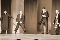 На репетициях «женщин» было ещё больше. Сергей Мухин, который в спектакле играет совсем не Виолу, а наоборот – её брата Себастьяна, стал вспоминать, как тоже ходил в юбке. «Приезжал педагог из Англии, учил нас пластике, - рассказал он. – У нас три женских роли, но мы все занимались на этих занятиях. Это был очень верный психологический ход - когда двенадцать актёров, и трое из них играют женщин. Поэтому вначале нас всех сделали женщинами. Какое-то время все ходили в юбках. Это был актёрский вызов».
