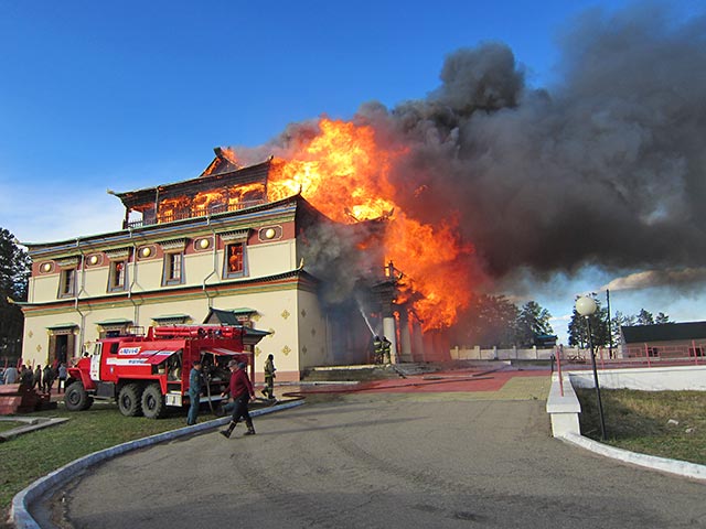 Главный храм крупнейшего в России буддийского Агинского монастыря в Забайкалье почти полностью сгорел 27 мая. Возгорание, причиной которого, по предварительной версии, стало неосторожное обращение с огнем, случилось около 21:00 по местному времени (около 15:00 по московскому). Пожар начался на втором этаже храма, и огонь быстро распространился на деревянные перекрытия, охватив верхний этаж и крышу.