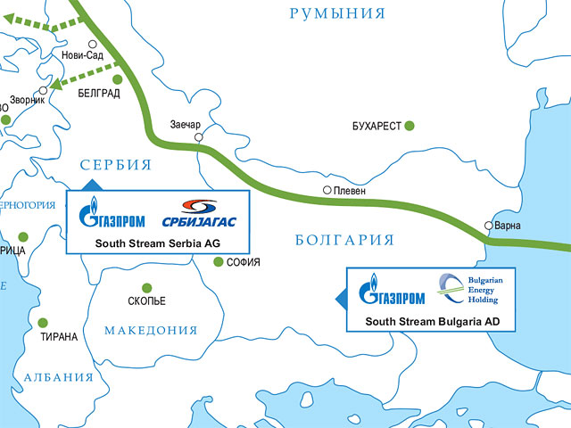 "Южный поток" стоимостью 16 млрд евро пройдет по территории Болгарии, Сербии, Венгрии и Словакии с возможным ответвлением в Австрию. Мощность газопровода должна составить 63 млрд куб. м в год, ввод в эксплуатацию запланирован на 2015 год, на проектную мощность он выйдет в 2018 году.