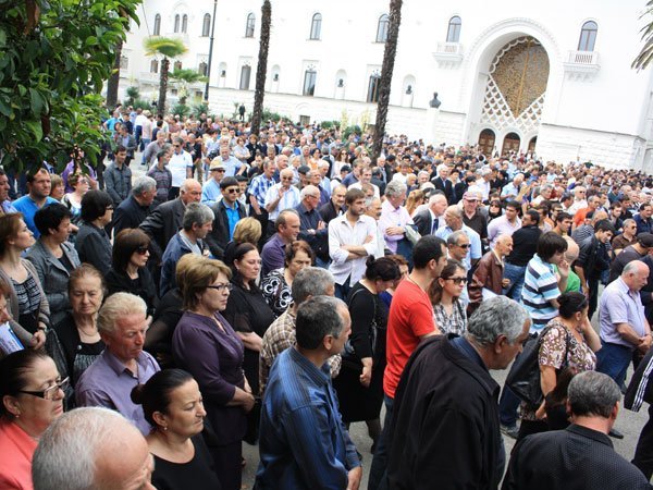 Александр Анкваб На вечер вторника уже достаточно давно была намечена демонстрация недовольных политикой Александра Анкваба, президента республики. Собраться люди должны были у драматического театра, который находится через сквер от дворца президента республики. Про эту демонстрацию, естественно, знал весь город, поэтому собралось достаточно много народу — несколько тысяч человек.