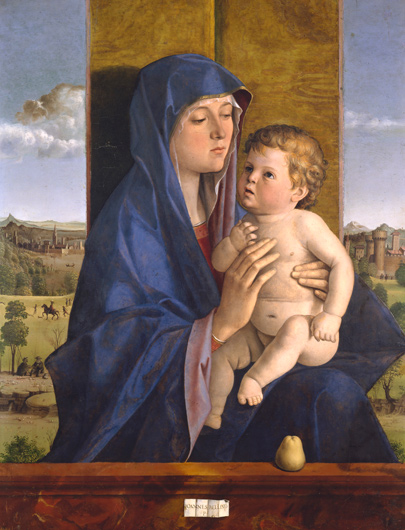 Джованни Беллини. Мадонна с Младенцем. Около 1488 Флоренция, революцию в искусстве которой произвел в свое время Джотто (на выставке его нет), ориентировалась преимущественно на форму и пространство. Эта школа сейчас отдана на откуп Беноццо Гоццоли (с картиной «Мадонна Смирение», в которой удивляешься даже не столько тщательной «выделке» деталей, сколько тому, что половина фона — просто разноцветное «абстрактное» живописное месиво — и это в середине XV века) и Франческо Пезеллино, менее известному, чем его учитель Филиппо Липпи (которого тут тоже нет). Ну и, понятное дело, сладостному любимцу публики Боттичелли с мастерской. Приехал один из трех (первый хранится в Национальной галерее Вашингтона, третий — в Берлинской картинной галерее) посмертных портретов убитого в пору заговора Пацци Джулиано Медичи, приписываемый Боттичелли и мастерской. Потому — минимум деталей, только осанистая, как из мрамора высеченная, фигура на фоне открытого окна как знака ухода. Приемы Боттичелли узнаваемы и в написанном вместе с учеником «Благословляющем Спасителе»: тонкие длинные пальцы, локоны, томные полуприкрытые глаза, акцент на линию и скульптурность фигуры. «Фирменная» боттичеллиевская упругая линия появилась, поскольку вначале он увлекся рисунком и еще, возможно, после занятий в ювелирной мастерской у кума (кум был как раз Боттичелли, и Алессандро Филипепи в итоге стал зваться Сандро Боттичелли). «Хотя он с легкостью изучал все, что ему хотелось, он тем не менее никогда не успокаивался, и его не удовлетворяло никакое обучение ни чтению, ни письму, ни арифметике, так что отец, которому надоела эта взбалмошная голова, отдал его, отчаявшись, обучаться ювелирному делу <…> В ту пору была величайшая дружба и как бы постоянное сотрудничество между ювелирами и живописцами, благодаря чему Сандро, который был человек бойкий и только рисованием и занимался, увлекся и живописью», — читаем у Джорджо Вазари.