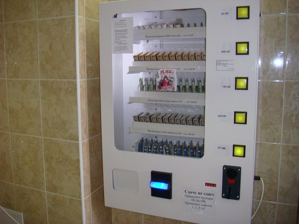 Действительно, такие установлены в количестве 2 штук. Студенты отнеслись к появлению их с энтузиазмом и периодически пользуются предложенным товаром, причем товар из аппарата в женском туалете расходится даже быстрее. Кстати, помимо презервативов автомат торгует влажными салфетками, платками и одноразовыми бумажными покрытиями для унитазов.