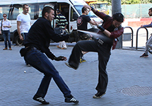 Около 30 человек приняли участие в согласованном "Радужном митинге" в московском гайд-парке возле Крымского моста, сообщает корреспондент "Граней". Перед началом акции у метро "Октябрьская", где собирались активисты, на них напала группа провокаторов. Они стали кидать яйца и распылять перцовый газ. Бывшему болотному узнику Николаю Кавказскому направили струю газа в лицо. Он собирался выступать на "Радужном митинге", но был вынужден поехать домой. ЛГБТ-активисты дали гомофобам отпор и обратили их в бегство (