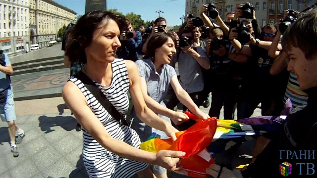 Около 13:00 возле памятника Юрию Долгорукому на Тверской были задержаны участницы акции за равноправие ЛГБТ Елена Костюченко и Анна Анненкова. Как сообщает корреспондент "Граней", они развернули радужный флаг с надписью "Брак! Дети! Безопасность!". Простоять с флагом им удалось всего несколько секунд. После этого на активисток напали полицейские и гомофобные провокаторы. За задержанием наблюдали несколько десятков журналистов.