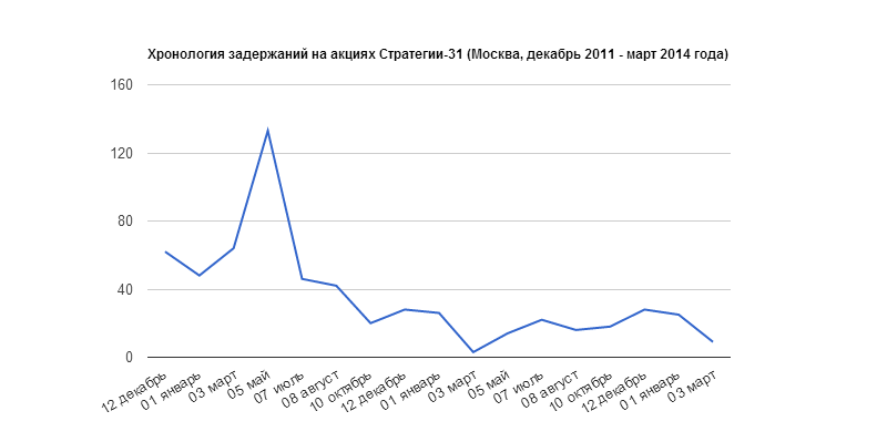 По данным ОВД-Инфо, с декабря 2011 года ни одна из 17 московских акций Стратегии-31 не прошла без задержаний. Впрочем, число задержанных сильно колебалось: от 3 до 133. В общей сложности за это время на митингах в защиту 31-й статьи Конституции были задержаны по меньшей мере 604 человека.