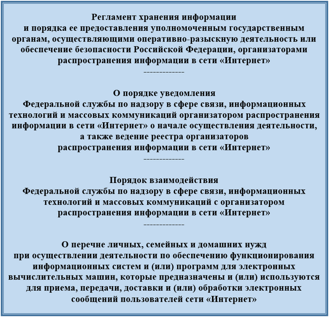 Подзаконка по 97-ФЗ — Регламент хранения информации и порядок ее предоставления уполномоченным госорганам Подзаконка по 97-ФЗ — Порядок уведомления РКН о начале деятельности и порядок ведения реестра Подзаконка по 97-ФЗ — Порядок взаимодействия РКН с организатором распространения информации Подзаконка по 97-ФЗ — Перечень личных, семейных и домашних нужд при осуществлении деятельности по функционированию ИС и ПО для ЭВМ Ранее по 97-ФЗ:Результат общественного обсуждения на площадке «РосКомЗакон»