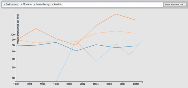 Тренды — это раздел, который позволяет пользователям построить линейный график по общему числу заключенных и скорости роста численности заключенных для одной и более стран. Полученные графики отражают изменения каждые два года с 1992 по 2012 год.