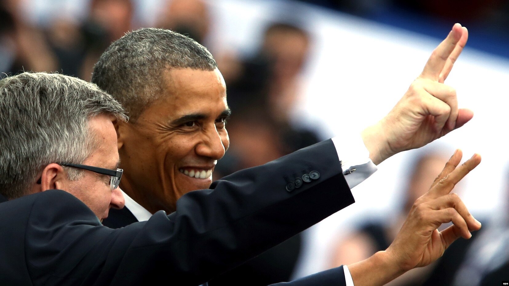 Обама и президент Польши Бронислав Коморовский выступили на Замковой площади в Варшаве перед тысячами варшавян и в присутствии делегаций из более чем 40 стран.
