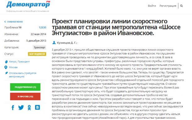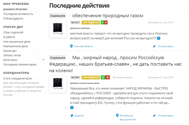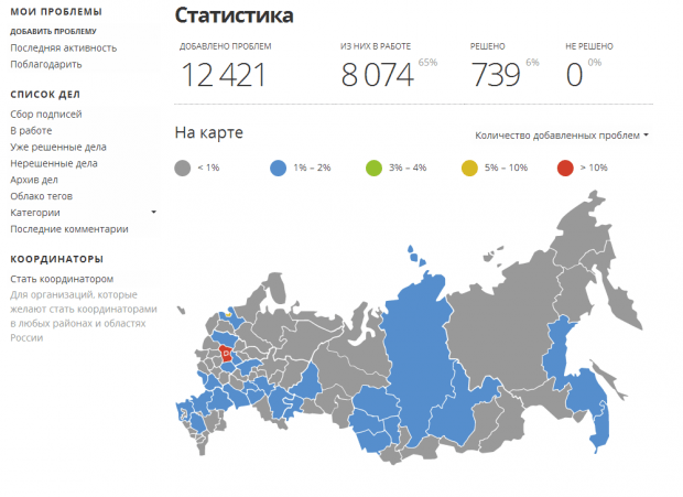 На данный момент добавлено более 12 тысяч проблем, из низ 65% находятся в работе, а за время работы проекта было решено 739 проблем.