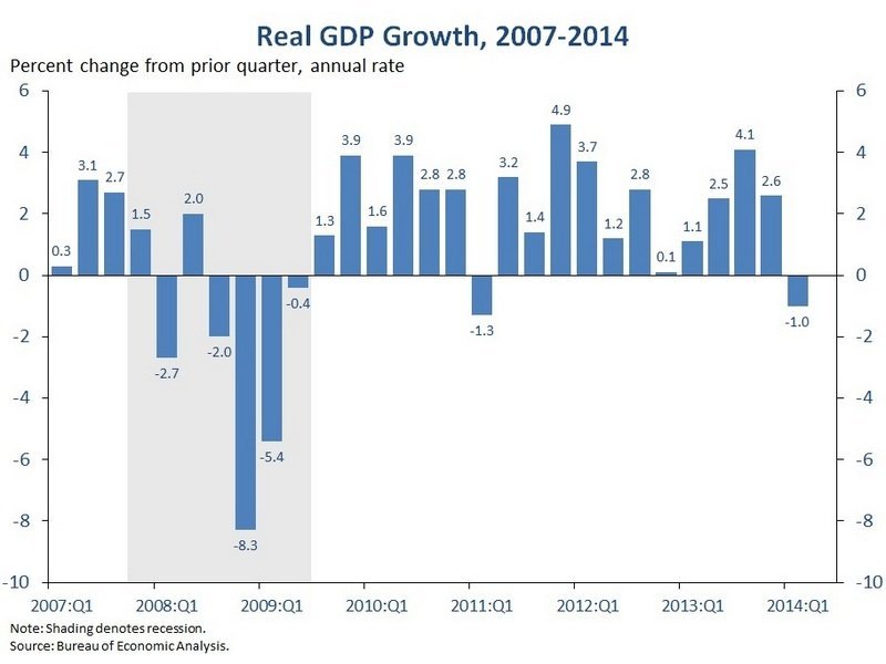 Динамика ВВП США По уточненным данным американской статистики, ВВП США за первый квартал 2014 года (в годовом исчислении) упало на 1%. Предварительные данные, опубликованные месяц назад, давали несколько лучший показатель – рост на 0.1%. Хотя, конечно, это трудно назвать ростом, но хотя бы не было падения. Однако уточненные данные внесли ясность – ВВП США снизился, и достаточно заметным образом.