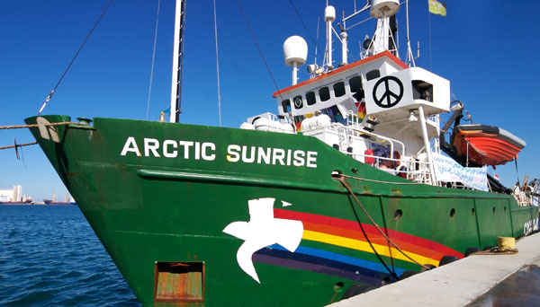 18 сентября ледокол экологов Arctic Sunrise подошел к российской буровой платформе «Приразломная», принадлежащей компании «Газпром». Активисты, протестовавшие против добычи нефти в Арктике, сделали попытку высадиться на платформу, однако были задержаны пограничниками, а судно на буксире было доставлено в порт Мурманска. На его борту находились 30 человек: активисты «Гринпис», а также фотограф и видеооператор. Весь экипаж был доставлен в Мурманск и арестован. Их обвинили в пиратстве, затем статья была переквалифицирована в хулиганство. В декабре дело было закрыто в связи с амнистией к 20-летию Конституции. После этого все 26 иностранцев выехали за пределы РФ. «Власти могут незаконно лишить нас ледокола, но они не в силах остановить протест: Greenpeace продолжает выступать против безответственных компаний, готовых рисковать природой Арктики ради нефти — российских, норвежских, американских и любых других», — заявил Дмитрий Литвинов, один из 30 задержанных активистов. 18 июня городской суд Санкт-Петербурга рассмотрит апелляцию юристов Greenpeace на решение Приморского районного суда, который не разрешил доступ экологам на судно Arctic Sunrise. Как заявили в организации, в октябре 2013 года юристы Greenpeace обращались с подобным ходатайством, однако получили отказ.