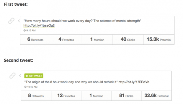 Например, на данном изображении хорошо видно, что второй твит оказался намного популярнее первого — по нему кликали в два раза чаще. Соответственно, ориентируясь на это, вы можете изменить заголовок вашей записи на сайте.