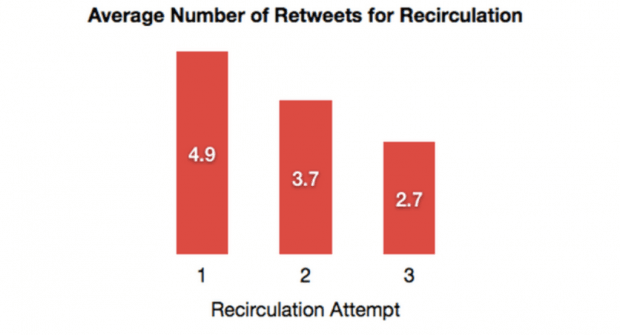 На графике показано среднее число ретвитов для первой, второй и третьей публикации одного и того же контента. С каждой новой публикацией число ретвитов становится меньше, но в общей сложности благодаря дополнительным публикациям трафик более чем удваивается.