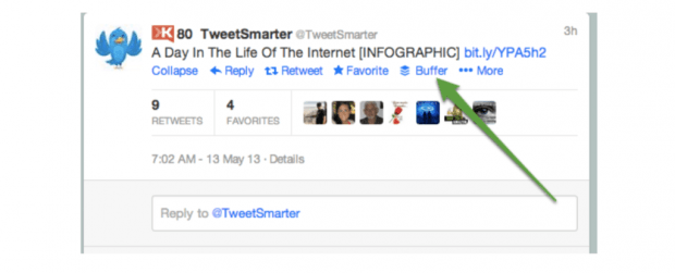 А если вы установите расширение Buffer для браузера, то сможете легко задавать время ретвитов чужих твитов — каждый раз, когда вы видите твит, достойный ретвита, то одним кликом сможете задавать ему график публикации у себя.