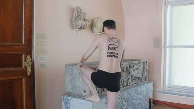 В Петербурге в восточном здании Эрмитажа прошла акция "Немытая Россия", сообщает корреспондент "Граней". Активист арт-группы "Синий всадник" разделся, залез в римскую гробницу и стал смывать со своего тела заранее нанесенную надпись "Единая Россия".