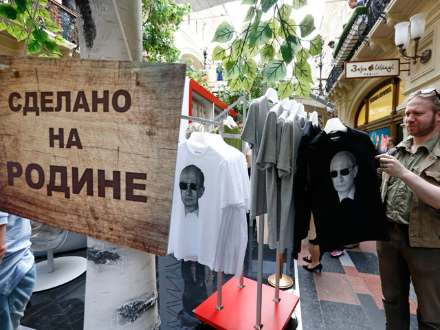 По данным станции, особой популярностью пользовались серые и зеленые футболки с изображением президента на коне и надписью "Нас не догонят", а также "крымские" майки (Путин в разноцветной рубашке сидит в шезлонге и пьет коктейль). Стоимость футболки составляет 1 200 рублей, продавались они в самом известном торговом центре столицы всего три дня.