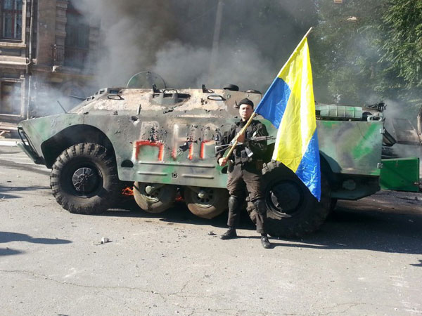 Фото: 0629.com.ua Твиттер ДНР сообщает, что «украинские каратели обстреляли штаб ополчения из РПГ. В здании начался пожар. Ополченцы удерживают позиции. Уничтожен БТР противника».