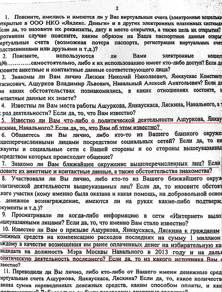 Тех, кого полицейские дома застали, опрашивали по специальному опроснику, который приносили с собой. Фотографию одной страницы из такого опросника пользователь Vladimirovich выложил на сайте politota.d3.ru. Всего в нем порядка 13 вопросов: разброс тем от «Имеются ли у вас виртуальные счета?» до «Знакомо ли вам ближайшее окружение вышеперечисленных лиц (Ашуркова, Ляскина, Янкаускаса, Навального. — The New Times). Если да, то назовите их анкетные и контактные данные, а также обстоятельства знакомства».