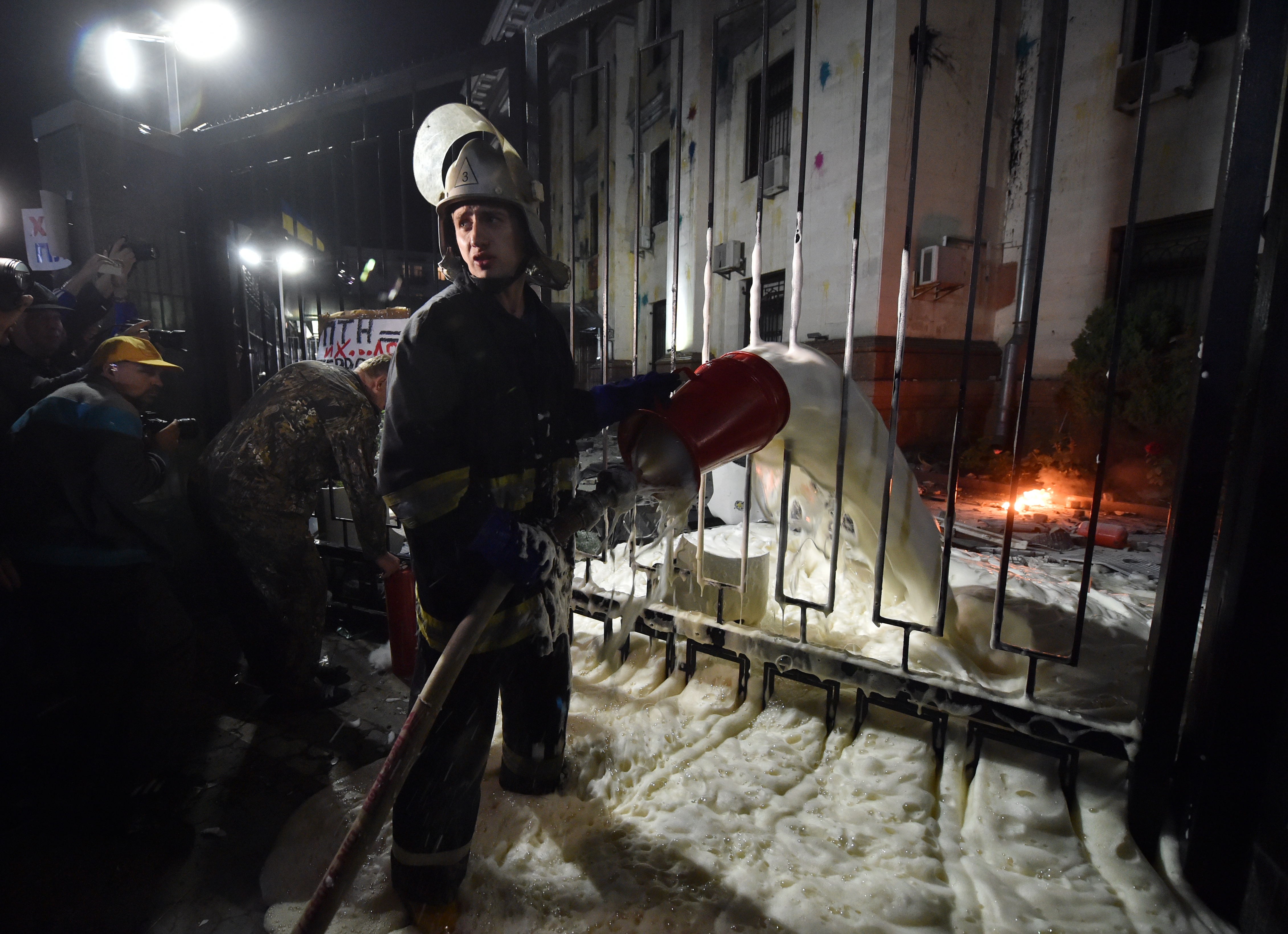 В субботу у российского посольства в Киеве состоялась акция протеста против политики России в отношении Украины. Демонстранты протестовали против проникновения российских танков на украинскую территорию и выражали гнев в связи с гибелью 49 человек на борту сбитого сепаратистами в Луганске самолета ИЛ-76. Протестующие сорвали российский флаг, перевернули несколько автомобилей, принадлежащих дипломатам, закидали здание яйцами и краской.