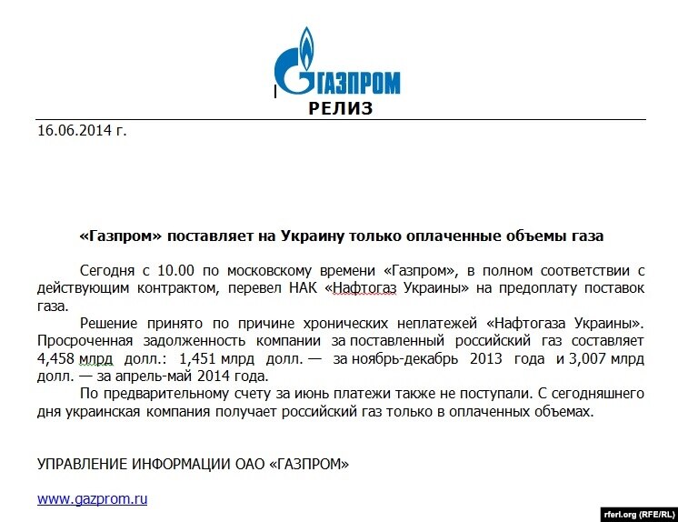 Как и было прописано в контракте, решение вступило в силу с 10 утра по московскому времени в понедельник, 16 июня. Оно принято из-за хронических неплатежей "Нафтогаза Украины", отмечается в заявлении "Газпрома". Просроченная задолженность компании за поставленный российский газ составляет 4миллиарда 458 миллионов долларов. По предварительному счету за июнь платежи также не поступали. Таким образом, с этого дня Украина будет получать российский газ только в оплаченных объемах.