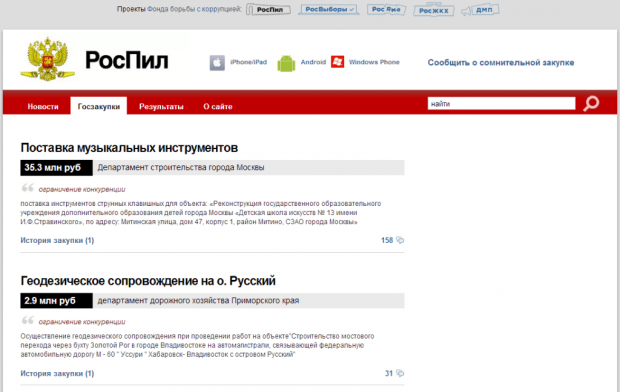 Проект имеет мобильные приложения для устройств на базе iOS, Android и Windows Phone. Любой пользователь может сообщить о сомнительной закупке.