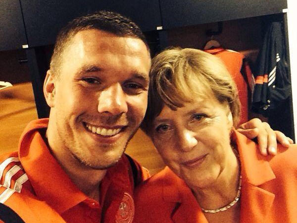 Нападающий сборной Германии по футболу Лукас Подольски сделал селфи (фото самого себя на сотовый) с канцлером Германии Ангелой Меркель. Снимок выложен в Facebook и Twitter футболиста.