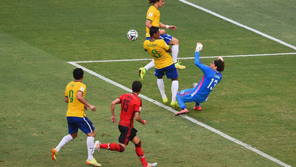 69-я мин: Открывать должна была сборная Бразилии счет. Один из игроков линии атаки получил мяч в штрафной площади, убрал защитника и пробил - штанга!