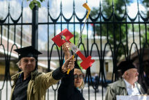 Преподаватели Государственного университета управления (ГУУ) и активисты профсоюза "Университетская солидарность" в четверг провели акцию протеста против массовых увольнений в этом вузе. Как сообщает корреспондент "Граней", акция прошла у здания Федеральной службы по финансовому мониторингу на Мясницкой улице. Активисты передали директору ведомства Юрию Чиханчину свое обращение, а также символический ключ от университета и клюшку для гольфа. Это связано с планами строительства площадки для мини-гольфа на территории ГУУ.