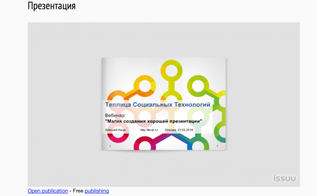 Презентации — это тот тип контента, который может быть полезен многим и которым часто делятся, поэтому не забывайте использовать и его. Вы можете создать презентацию на основе какого-либо вашего материала, например, в PowerPoint или с помощью Google Drive, а затем загрузить на SlideShare или Issue и делиться ими на вашем сайте и в социальных сетях.