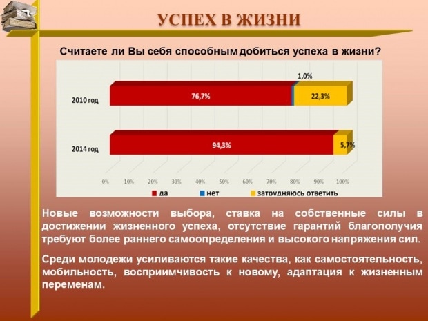 Наиболее ярко социальный оптимизм молодых людей выражает их уверенность в способности добиться успеха в жизни. В представлениях молодежи о жизненных ценностях, по данным опроса, явно преобладают четыре составляющие: семейное счастье и любовь; материальный достаток; достижения в профессиональной деятельности, а также успешная карьера.
