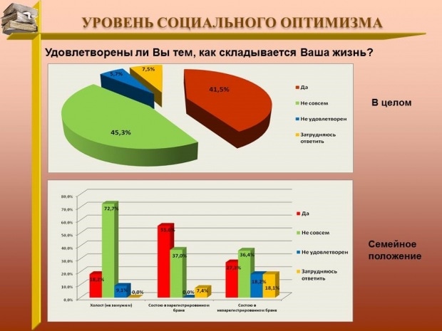 Однако молодежной аудитории в силу возрастных особенностей свойственна высокая степень социального оптимизма, что подтверждают результаты количественного опроса. В группе состоящих в зарегистрированном браке отмечена максимальная степень удовлетворенности жизнью; минимальная степень оптимизма — у холостяков.