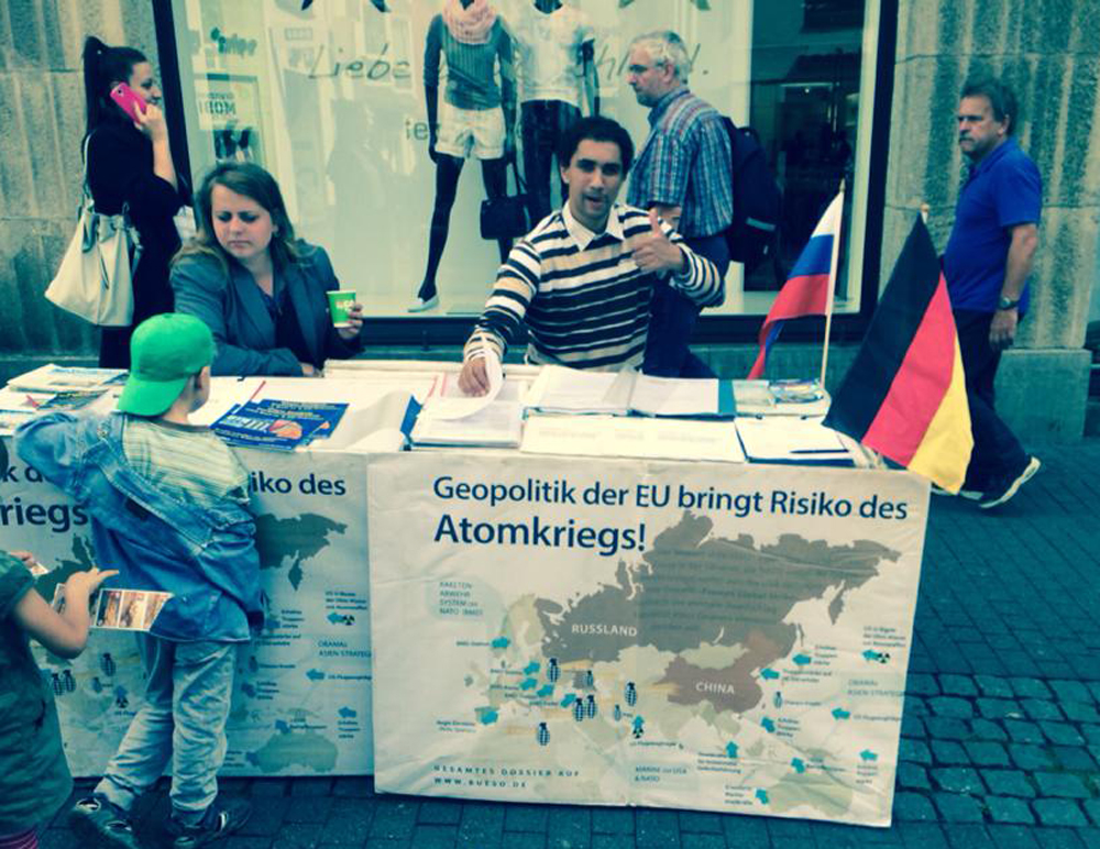 Чуть более разговорчивым оказался гражданский активист по имени Давид (см. фото), устроивший вместе с единомышленницей по имени Анна сидячий пикет в Дюссельдорфе в середине июня. Прохожим раздавались листовки с таким текстом: «Германия, которая прошла через две мировые войны и ужасы нацизма, должна первой противостоять украинскому нацизму, которому покровительствует Запад». На вопрос The Nеw Times, помогал ли ему в организации акции кто-то из граждан России или Украины, Давид не без гордости заметил, что у него «крепкие связи» с российским посольством (в ФРГ). Подробности, правда, он раскрывать отказался.