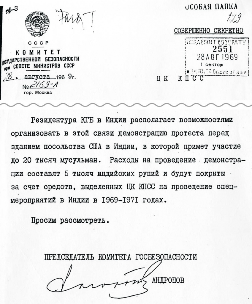 «Активные мероприятия» — так назывались пропагандистские акции, которые КГБ СССР проводил по всему миру. В данном документе — подготовка «активки» в Индии в 1969 г.
