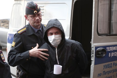 На фото: Россия. Санкт-Петербург. 16 мая 2014 года. Болельщик "Зенита" Алексей Нестеров, известный среди фанатов как "Гулливер", перед началом судебного заседания по делу о нападении на игрока "Динамо" Владимира Граната.