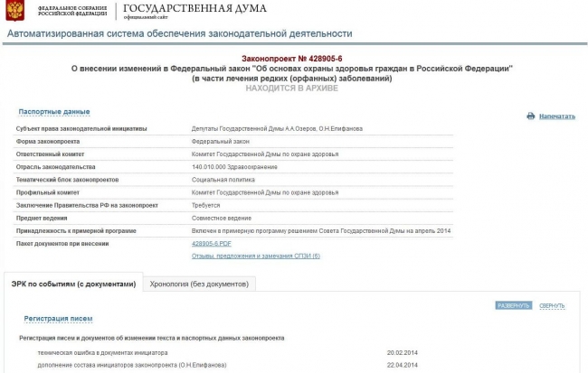 В отзыве на законопроект, подписанном руководителем аппарата правительства вице-премьером Сергеем Приходько, сухо констатируется, что за лечение орфанных заболеваний отвечают регионы, а принятие проекта приведет к увеличению расходов федерального бюджета. Посему предлагается проект не поддерживать. Также против проекта выступили Счетная Палата РФ и думский комитет по социальной политике.