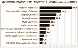 ГБУ «Институт регионального развития» совместно с НП «Бюро социальных технологий» презентовали итоги исследования культурно-досуговых практик псковичей, проведенного в Пскове в мае 2014 года. Социологи опросили 1200 человек по месту жительства, то есть туристы в выборку не попали.