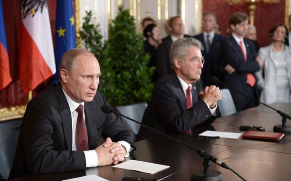 Находясь в Вене, Владимир Путин одобрительно высказался относительно мирного плана Порошенко, однако озабоченно сообщил журналистам, что уже после достижения соглашения начался бой под Славянском, что, конечно, не вписывается в концепцию прекращения огня. Президент Австрии в ответ заявил, что выступает против усиления санкций в отношении России. Впрочем, Путин также пообещал «защищать этнических русских на Украине и тех, кто считает себя частью широкого русского мира» - каким образом будет организована защита, глава государства не уточнил.