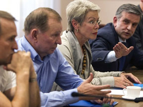 Переговоры в Донецке. Фото: mediaport.ua Действительно, группа переговорщиков, в которую входят второй президент Украины Леонид Кучма, посол России в Киеве Михаил Зурабов, представитель действующего главы ОБСЕ Хайди Тальявини и близкий президенту Путину украинский политик Виктор Медведчук, 23 июня в Донецке встретилась с лидерами сепаратистов и смогла договорится о прекращении огня до пятницы, 27 июня. До этого переговорщики встретились с президентом Порошенко, однако о результатах их беседы журналистам мало что известно.