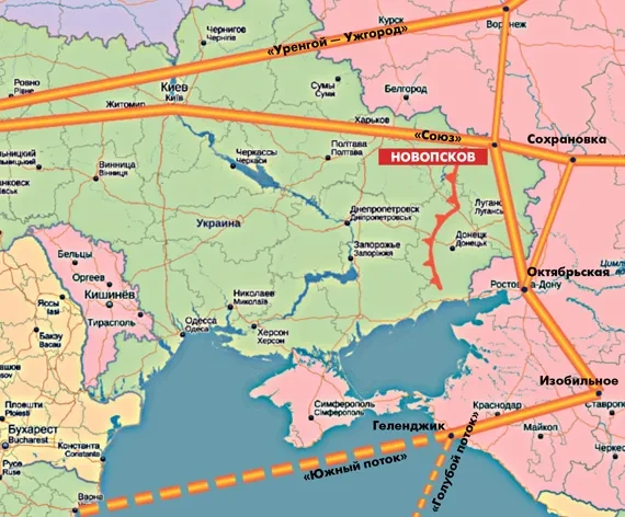 Но «Южный поток», если он все-таки будет построен, еще нужно будет заполнить. Ветка в Изобильный (Ставропольский край), где поток будет начинаться, идет как раз из Новопскова. Есть заблаговременно построенный обходной маршрут Сохрановка — Октябрьская, но его мощности в 28 млрд кубометров в год будет явно недостаточно. Если бы Новопсков находился под контролем Украины, она в любой момент могла бы поставить под вопрос наполнение «Южного потока». Так что свежесозданный Союз народных республик имеет для России более чем стратегическое значение. С точки зрения газовой войны Новопсков — прямо как Севастополь.