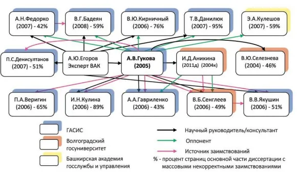 Об обширных связях профессора Гуковой свидетельствует схема (рис. 1). На ней показаны соискатели ученой степени, защитившие диссертации с массовыми некорректными заимствованиями. Масштабы заимствований (количество окрашенных страниц в таблице заимствований Диссернета от числа страниц основного текста диссертации) указаны в процентах. На схеме также представлен характер связей между А.В. Гуковой и ее коллегами и соискателями ученых степеней: научный руководитель или консультант, оппонент, источник текста.