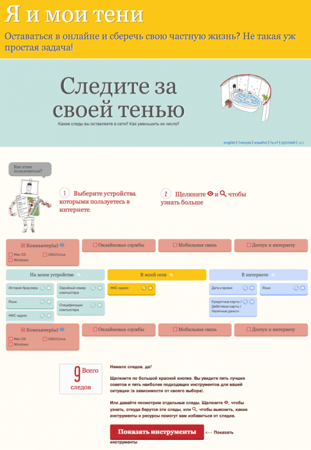 Для того, чтобы правильно подобрать нужные инструменты, которые подойдут для каждого конкретного случая, сайт Я и моя тень позволяет выбрать устройства, с помощью которых вы пользуетесь интернетом, чтобы понять, какую именно информацию вы оставляете после себя, чтобы в дальнейшем иметь возможность контролировать свою цифровую тень.