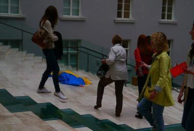 © IZOLYATSIA. Platform for Cultural Initiatives На биеннале современного искусства «Манифеста 10» в Петербурге художница из Донецка Мария Куликовская провела несанкционированную акцию – легла на ступени двора Главного штаба, завернувшись в украинский флаг.