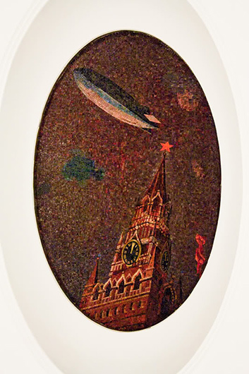 Мозаика Дейнеки на ст. м. Маяковская — «Дирижабль над Спасской башней ночью» В конце ХХ века / [тайкун Т. —] владелец их производства: фигура этого квазиперсонажа — знак неразрывной связи между кровожадным стремлением к наживе путинских олигархов и насилием тоталитарных режимов XX века. Тайкун Т. инвестирует в строительство нового дирижабля — на солнечной батарее (солнечная мощь авторитарной власти, которая приносит небесный покой); этот дирижабль станет коммуникационным сервером. Здесь мотив дирижабля трансформируется в явную фигуру связи между властью и населением. Однако пилот Л., которому мы вроде как симпатизируем, угоняет его, хочет сорвать банк для себя. Пилот этот, впрочем, такой же громила, как и его «коллеги», только «из молодых, да ранних» — все представляет себе, что он не по ошибке / на этой свадьбе с Д., дочерью тайкуна Т. Эту дочку, как и папашу, он кидает, и тут к папаше подкатывает его конкурент, провайдер П. (ну, здесь, наверно, объяснять не надо, кто кроется за инициалом — кукловод, Дедал, гипнотизер, вонзающий в лоб Л. матовую трость). Путин вроде как предлагает помощь первому олигарху, приставляет бинокль к его глазам — и наносит сзади удар. Типичные приемы, растиражированные в массовой культуре, — взять любой отечественный сериал о застенках НКВД. Важно, впрочем, заметить, что наблюдаемый веер персонажей — нарочитая условность, обе враждующие стороны (провайдер-Путин vs. силовик-пилот с олигархом Т.) — похоже, однополярные, их вынули из одного чемоданчика.